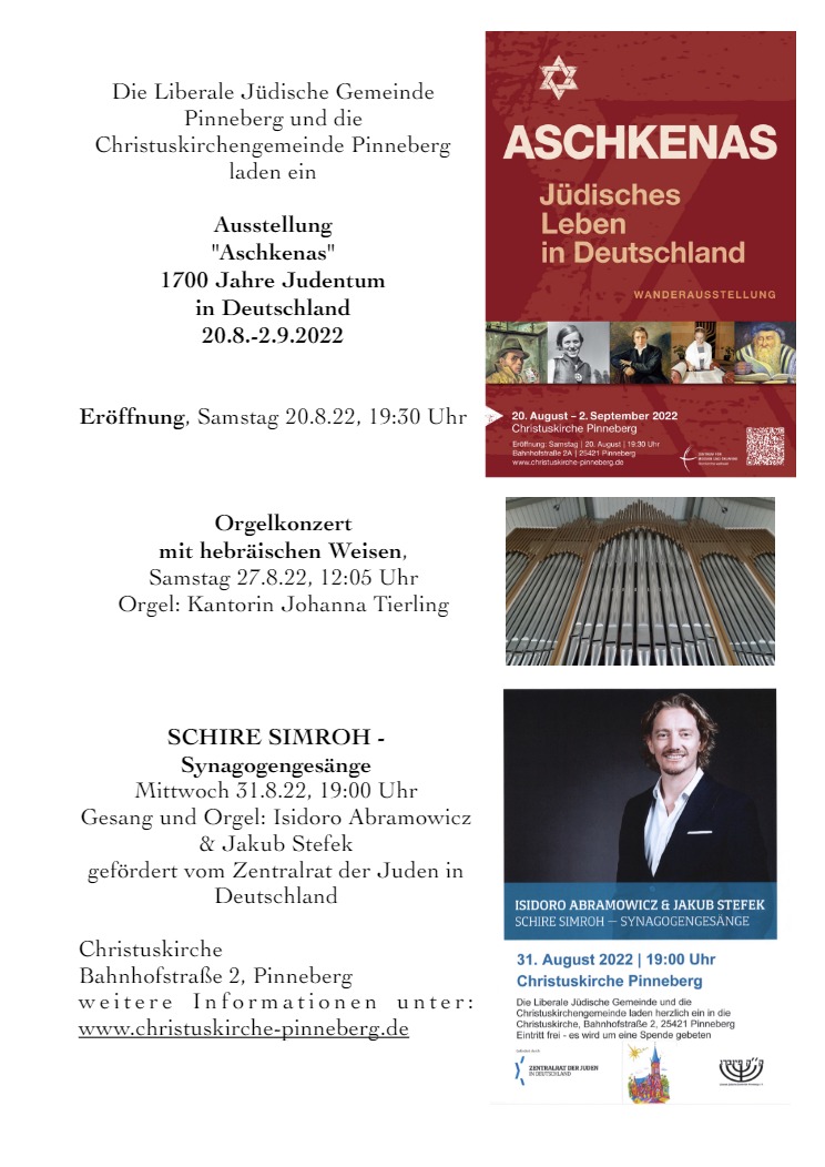 Offiziell wurde 2021 als Jubiläumsjahr „1700 Jahre jüdisches Leben in Deutschland“ begangen – die vielfältigen bundesweiten Aktionen dauern wegen der Einschränkungen durch die Corona-Pandemie im letzten Jahr auch 2022 noch an. Die Liberale Jüdische Gemeinde und die Christuskirchengemeinde laden in Pinneberg gemeinsam zu unterschiedlichen Veranstaltungen ein.